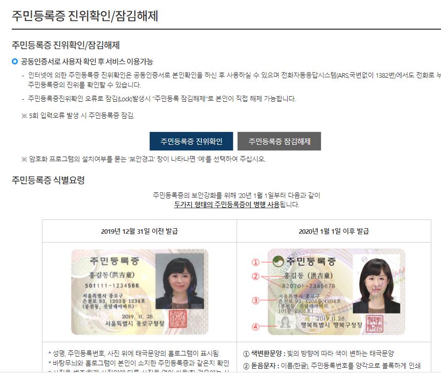 - 인터넷에 의한 주민등록증 진위확인은 공동인증서로 본인확인을 하신 후 사용하실 수 있으며 전화자동응답시스템(ARS,국번없이 1382번)에서도 전화로 누구나 주민등록증의 진위를 확인할 수 있