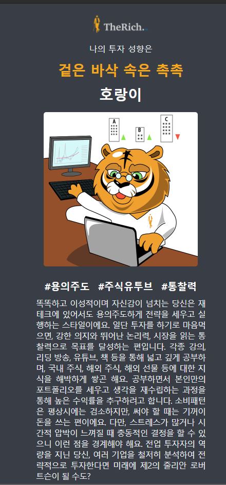 결과페이지는 성향을 대표하는 동물로 썸네일로 나타내고 간단한 해석이 보입니다.