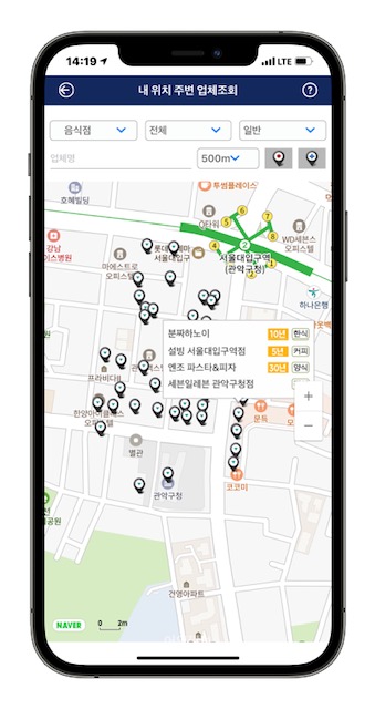 내 위치를 기준으로 음식점, 제과점, 주점 등 전국 식품업소를 검색할 수 있고, 업소위반사항, 회수제품 등 정보도 연결하여 한번에 확인