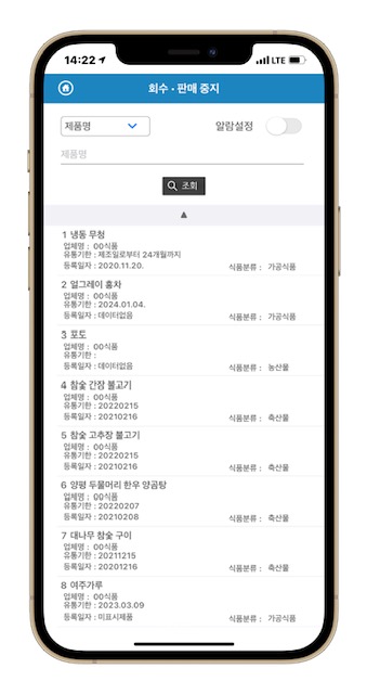 이런 기능 외에도 '회수 판매 중지 상품'을 검색할 수 있습니다. 알람설정으로 업체가 등록 될 때 푸쉬로