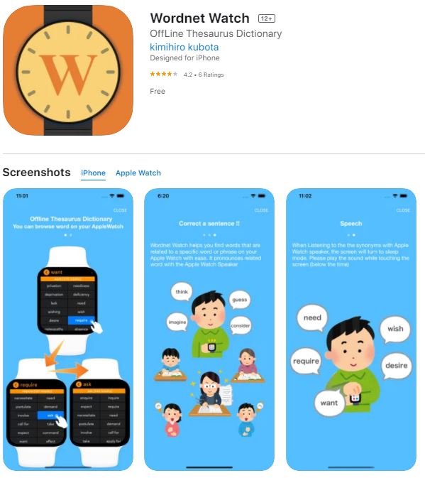 아이폰 전용 앱입니다. 그런데 조금 재미있습니다. 워드넷 워치는 애플워치용 동의어 사전 앱입니다. 동의어에 대한 빠른 검색을 수행할 수 있으며 150,000개 이상의 단어가 온/오프라인에서 포함됩니다. 그 단어들은 애플워치 스피커를 사용하여 발음도 할 수 있습니다. 일반적으로 영어사전도 아닌 동의어 사전... 그래도 꼭 필요하신분이 있으시겠지요?