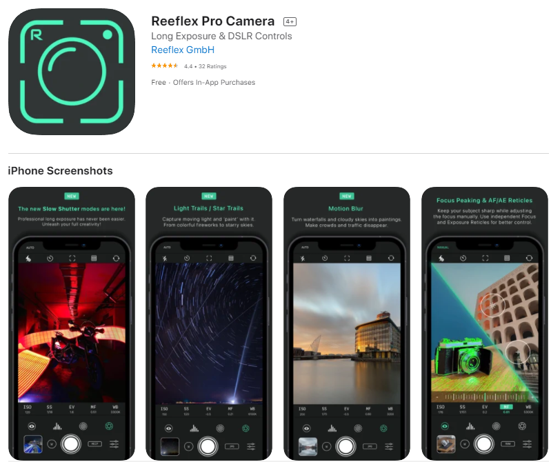 Reeflex는 풍부한 전문 도구 세트와 함께 포커스, 노출 및 화이트 밸런스에 대한 완전한 수동 제어를 제공합니다. HEIF, JPG, TIFF 또는 RAW로 촬영할 수 있습니다. 호환 장치의 경우 Apple ProRAW 형식으로 촬영할 수도 있습니다.