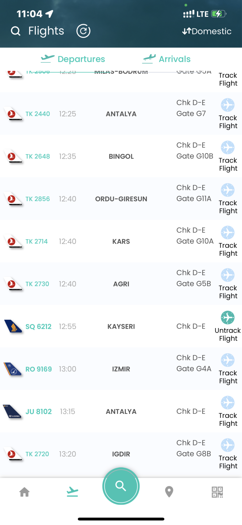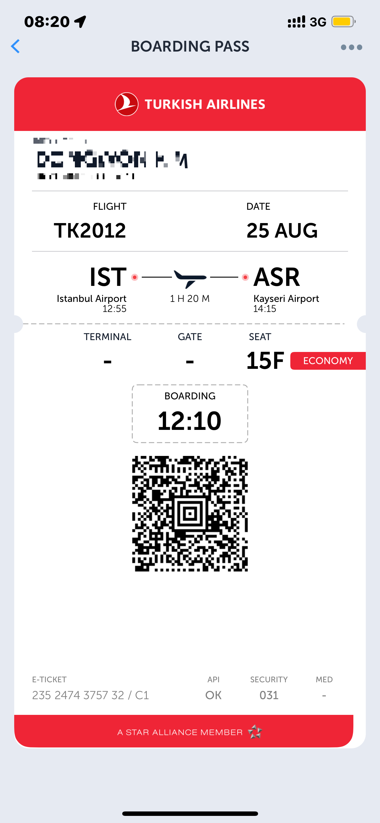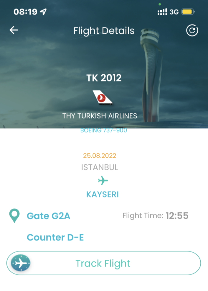터키항공에서 확인한 저의 탑승권은 보딩게이트가 나와 있지 않습니다. 이스탄불공항 어플에서 금일 탑승할 항공기를 검색하면 아래와 같습니다. (동일한 오전 08:20분 경 캡쳐한 화면입니다)