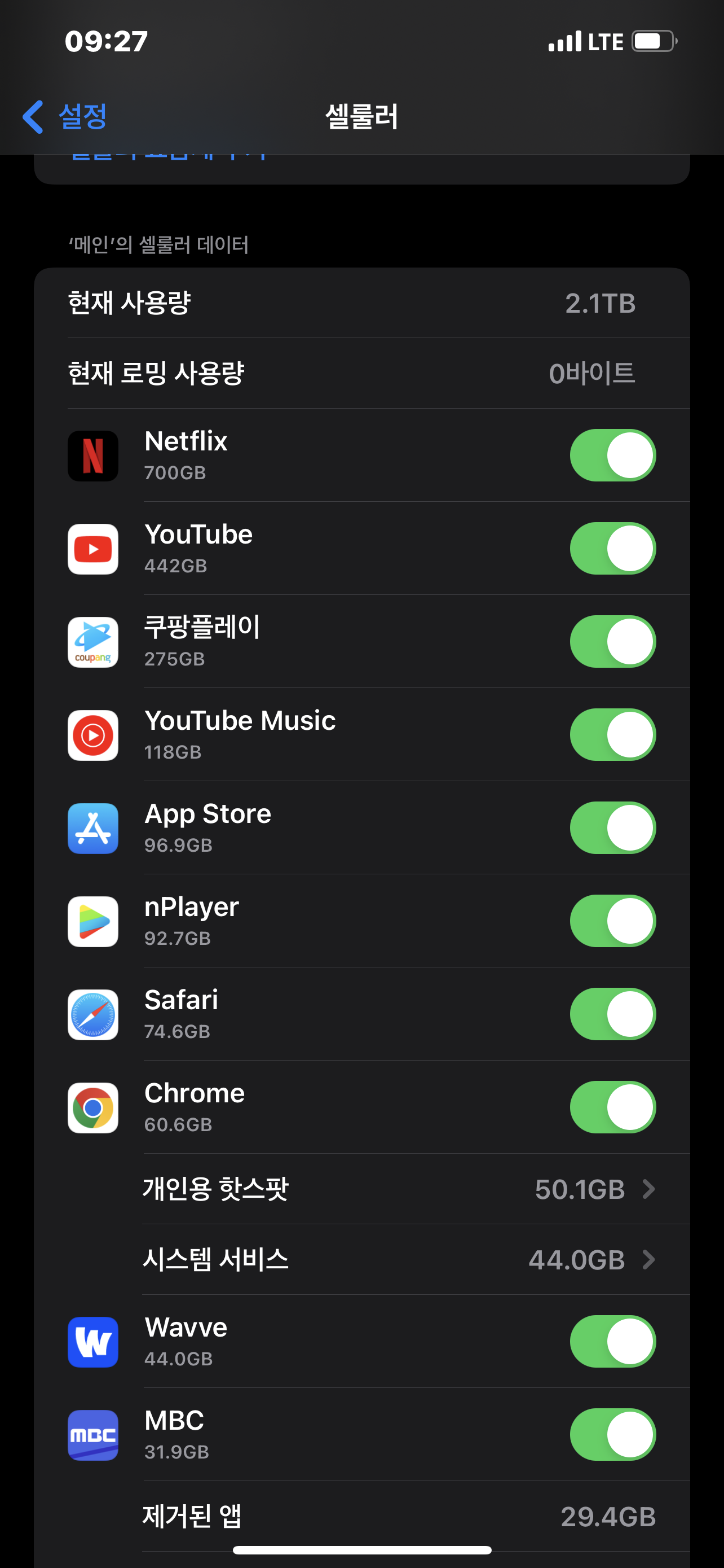 2. 데이타 소모가 많은 앱은 셀롤러 데이타를 사용하지 못하게 설정하세요. (실수 방지)