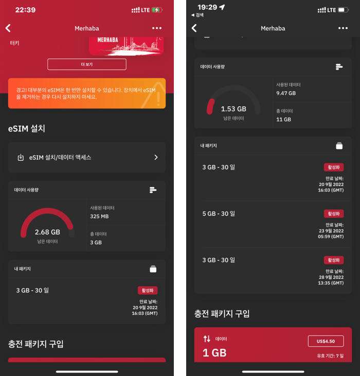 제가 구매하는 구매내역입니다. 3G로 충분할꺼라고 생각했는데, 2번이나 추가 충전을 했습니다. 여행지는 이스탄불과 카파도키아였으며, 해당 지역에서 불편함 없이 충분히 이용을 했습니다. 아이폰 esim 을 사용할 때 주의할점은 2가지입니다.