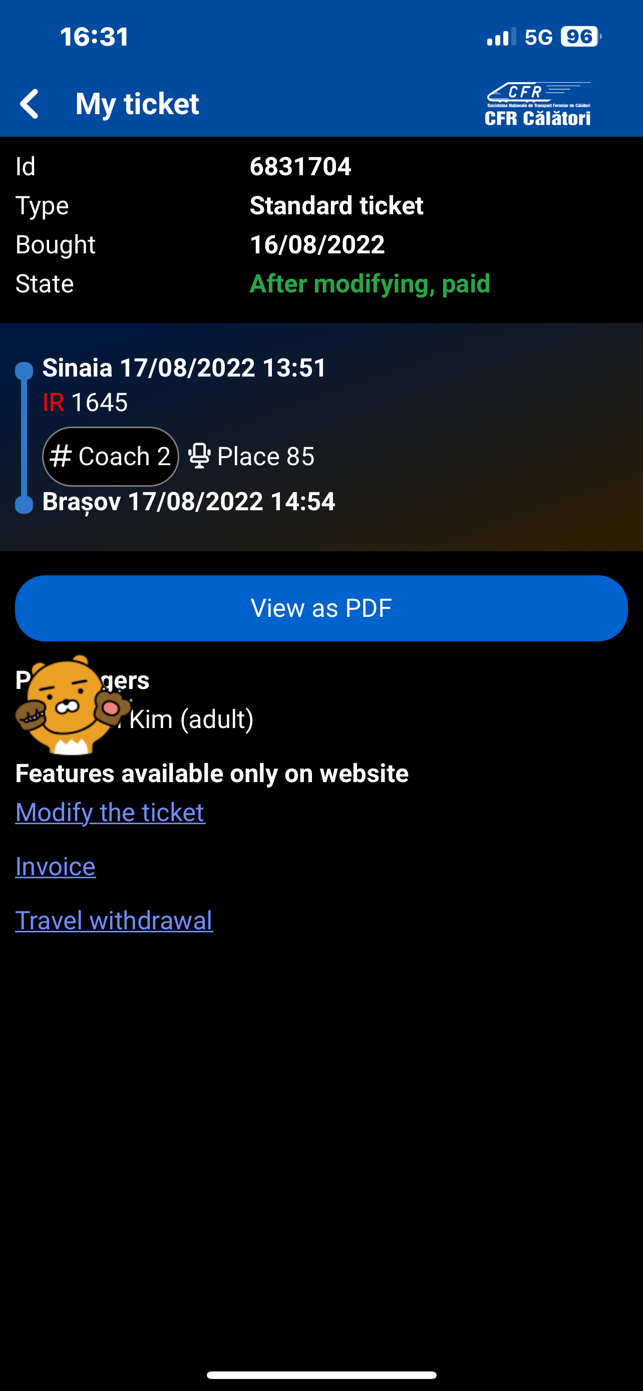 여행은 예기치 않은 일이 자주 발생하는 법입니다. 저 같은 경우는 방문하기로 한 시설이 휴무가 하는 바람에 기차 시간을 압당겨 타야 할 일이 생겼습니다. 이럴 때 앱에서 바로 'modify the ticket' 메뉴로 쉽게 변경할 수 있습니다. 변경 수수료는 발생하지만 아주 저렴해서 부담이 없습니다. 또한 취소도 간편하게 할 수 있습니다. 바로 바로 처리가 되어서 편리했습니다.