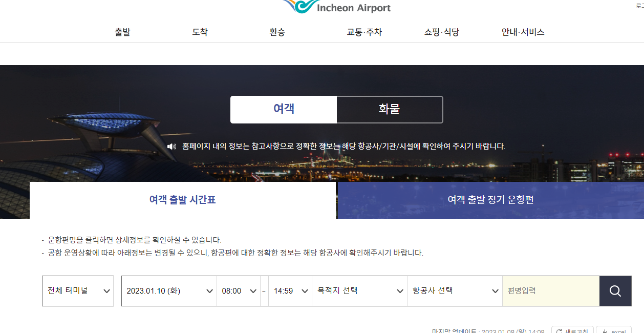 여객 출발시간표에서 본인이 탑승할 항공편을 검색합니다. 시간과 목적지에 대한 옵션이 있으며, 본인이 항공편명을 기억하고 있다면 항공편명을 입력해도 됩니다.
