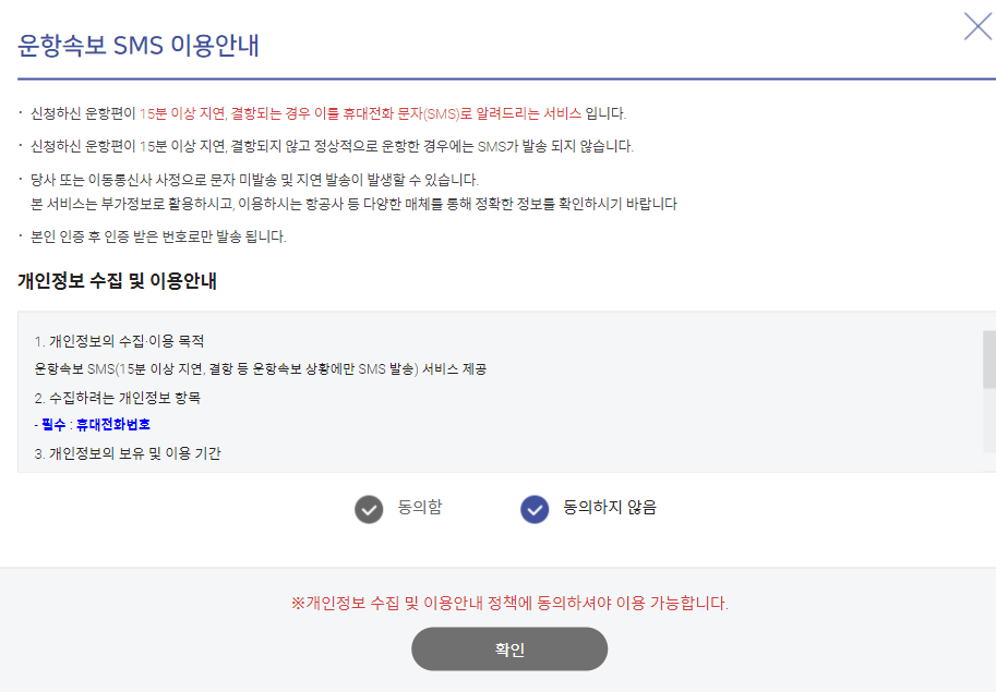 운항속보 SMS를 신청할 수 있는 안내창이 뜹니다.