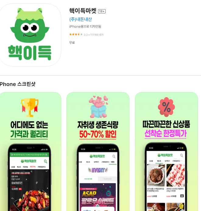 회사명이 (주)내돈내산 입니다. 회사명이 재미있습니다. 여기서 만든 마켓 어플 핵이득마켓입니다. 요즘 순안주좀 즐긴다는 분들 사이에서 가성비로 많은 이기를 얻고 있습니다.
